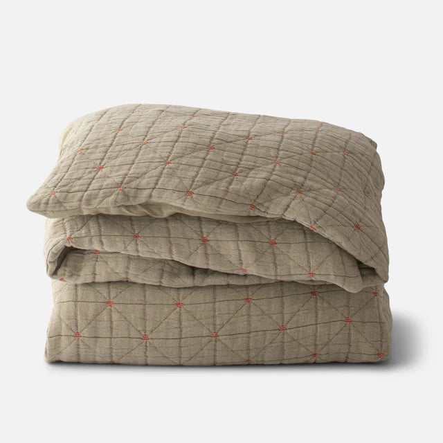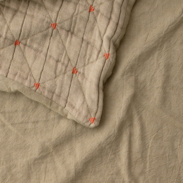 This duvet perfectly blends comfort with clean lines. Made from a yarn-dyed matelassé fabric, it offers a soft, cozy, worn-in feel, while the quilted triangles add just the right amount of loft. Playful red stitching adds a pop of color, a nod to the tradition of yarn quilting. The reverse side features a cotton twill in the same rich color, making this duvet both playful and comfortable. It features a hidden zipper closure.