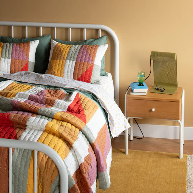 Inspired by classic craftsmanship, this modern rooftop quilt cleverly blends traditional quilting techniques with bold graphic patterns for a look that's both playful and practical. Earthy neutrals, a pop of red, and crisp white create a playful color palette that's both comfortable and eye-catching. Featuring channel stitching and soft cotton, it's perfect for draping over a bed or adding texture to a sofa. Made in India from 100% cotton.