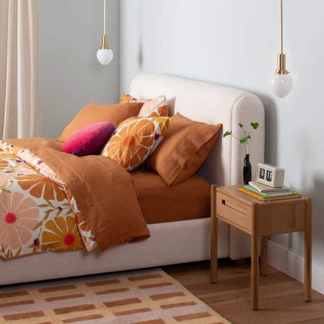 This floral collection, featuring vibrant tones of persimmon, peach, and purple, evokes the retro charm of the 1970s. The optimistic and confident floral pattern of the Sunburst Duvet Cover is sure to add a touch of cheer, color, and nostalgia to your bedroom.